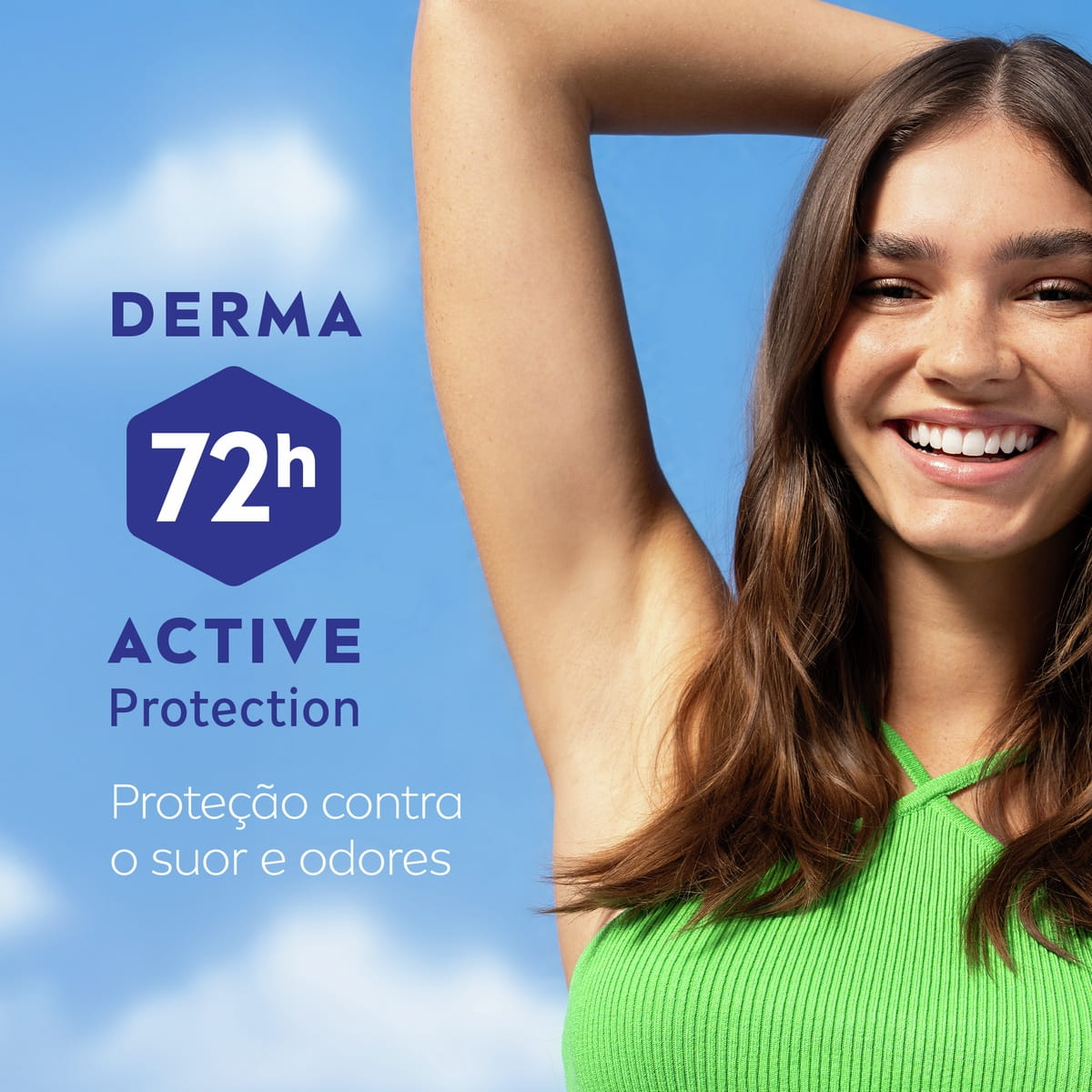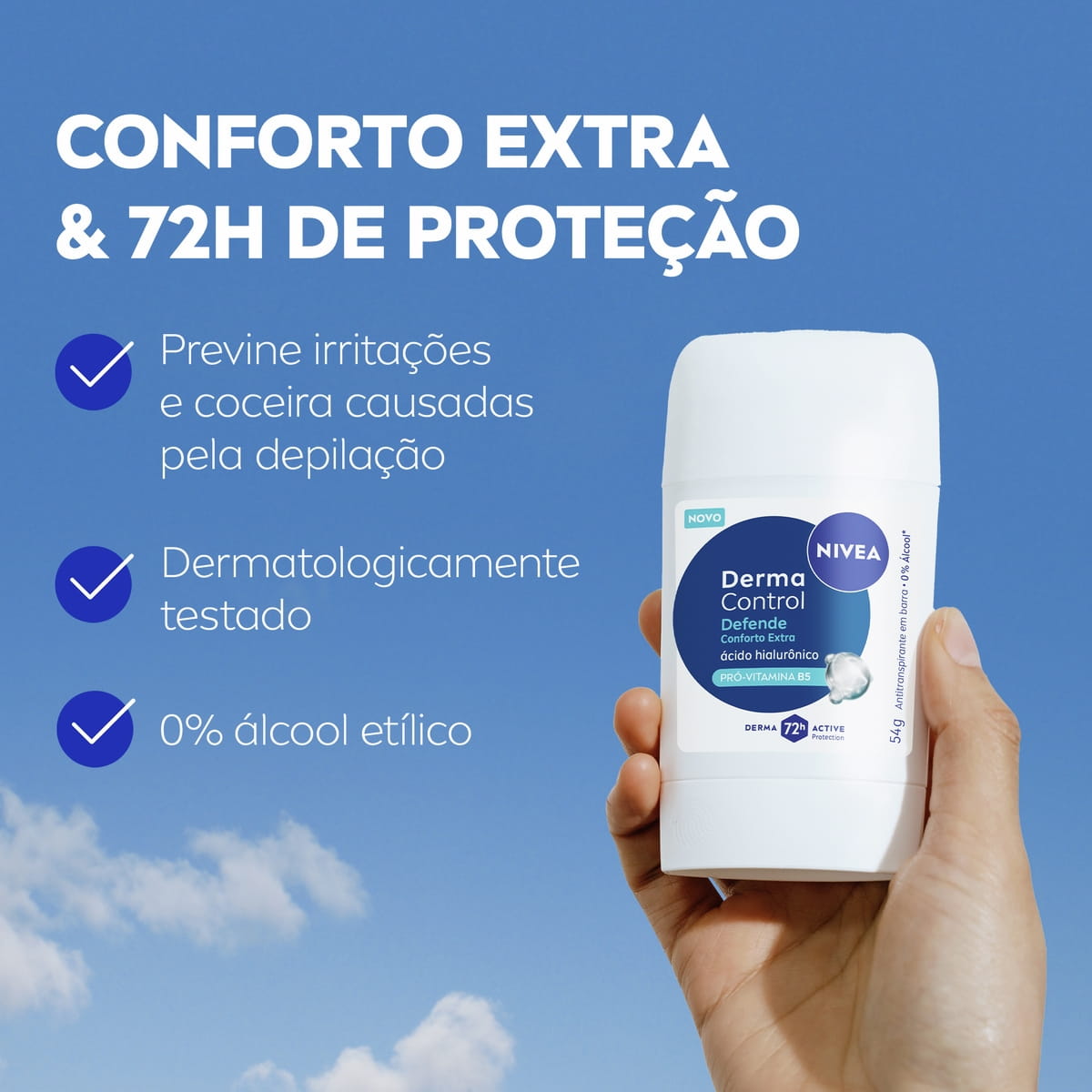 NIVEA Desodorante Stick Derma Control Defende oferece proteção 72h contra o suor e o mau odor, enquanto cuida das axilas com Ácido Hialurônico puro e Pró-Vitamina B5. Sua fórmula sem álcool etílico é ideal para pele sensível, prevenindo irritações e coceira, inclusive após a depilação.