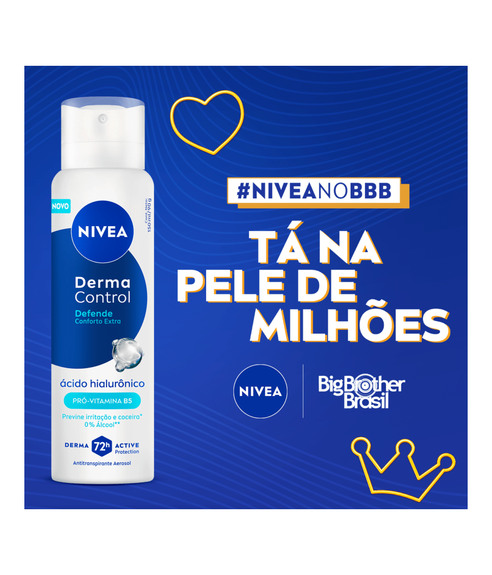 NIVEA Desodorante Aerossol Derma Control Defende oferece proteção 72h contra o suor e o mau odor, enquanto cuida das axilas com Ácido Hialurônico puro e Pró-Vitamina B5. Sua fórmula sem álcool etílico é ideal para pele sensível, prevenindo irritações e coceira, inclusive após a depilação.