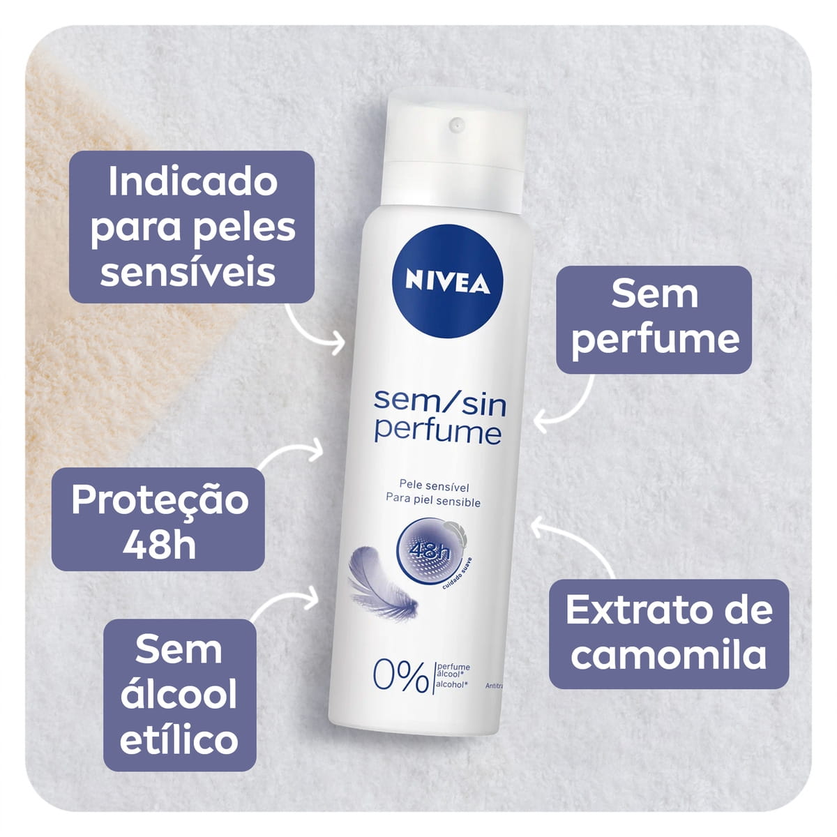 NIVEA Desodorante Antitranspirante Aerossol Sem Perfume é o aliado perfeito para peles que são mais delicadas, promovendo cuidado e proteção por 72 horas, graças a fórmula exclusiva Derma e Proteção Ativa que acelera o processo de regeneração natural da pele das axilas.