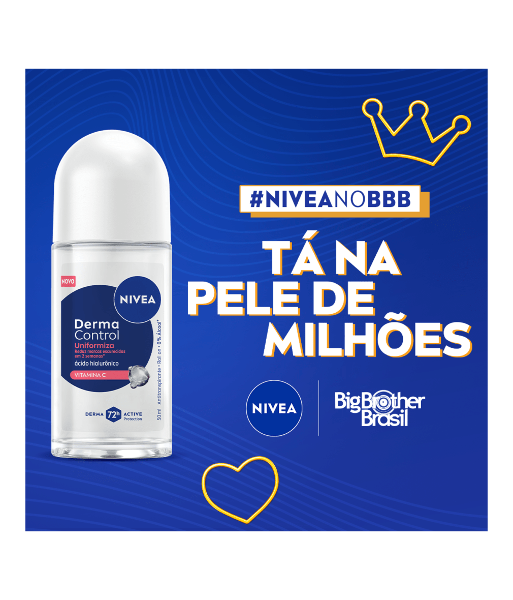 NIVEA Desodorante Roll-On Derma Control Uniformiza é um antitranspirante desenvolvido para oferecer proteção intensa contra o suor e o mau odor, cuidando da pele das axilas com uma fórmula especial que inclui Ácido Hialurônico e Vitamina C.