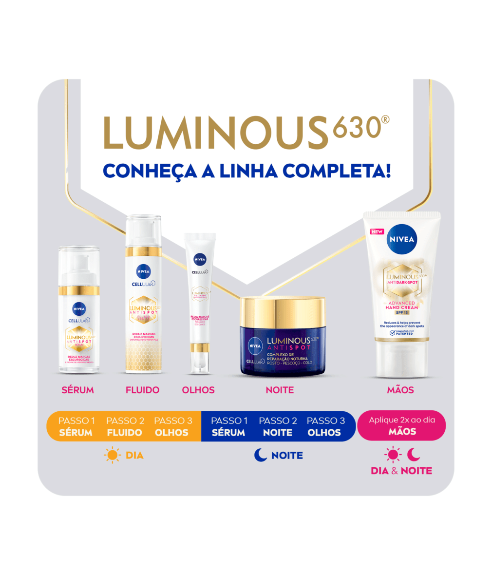 NIVEA Fluido Facial Cellular Luminous 630® é um produto inovador que utiliza a tecnologia patenteada Luminous 630® para reduzir manchas escurecidas e uniformizar o tom da pele.