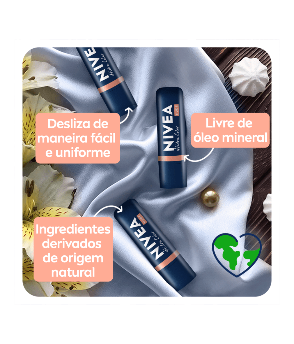 NIVEA Hidra Color Nude combina cor suave com o cuidado confiável de NIVEA. Com fórmula livre de óleo mineral, NIVEA Hidra é enriquecido com manteiga de karité, óleo de amêndoas orgânico, vitamina E. Com acabamento nude intenso, tem aroma floral suave especialmente desenvolvida para o uso diário.