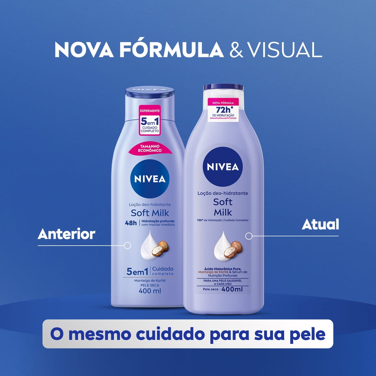 NIVEA Loção Deo-Hidratante Soft Milk é um hidratante corporal que garante 72h* de nutrição profunda. Sua fórmula inovadora e enriquecida com ácido hialurônico puro e manteiga de karité, proporciona uma pele saudável e hidratada a cada uso. *com uso regular