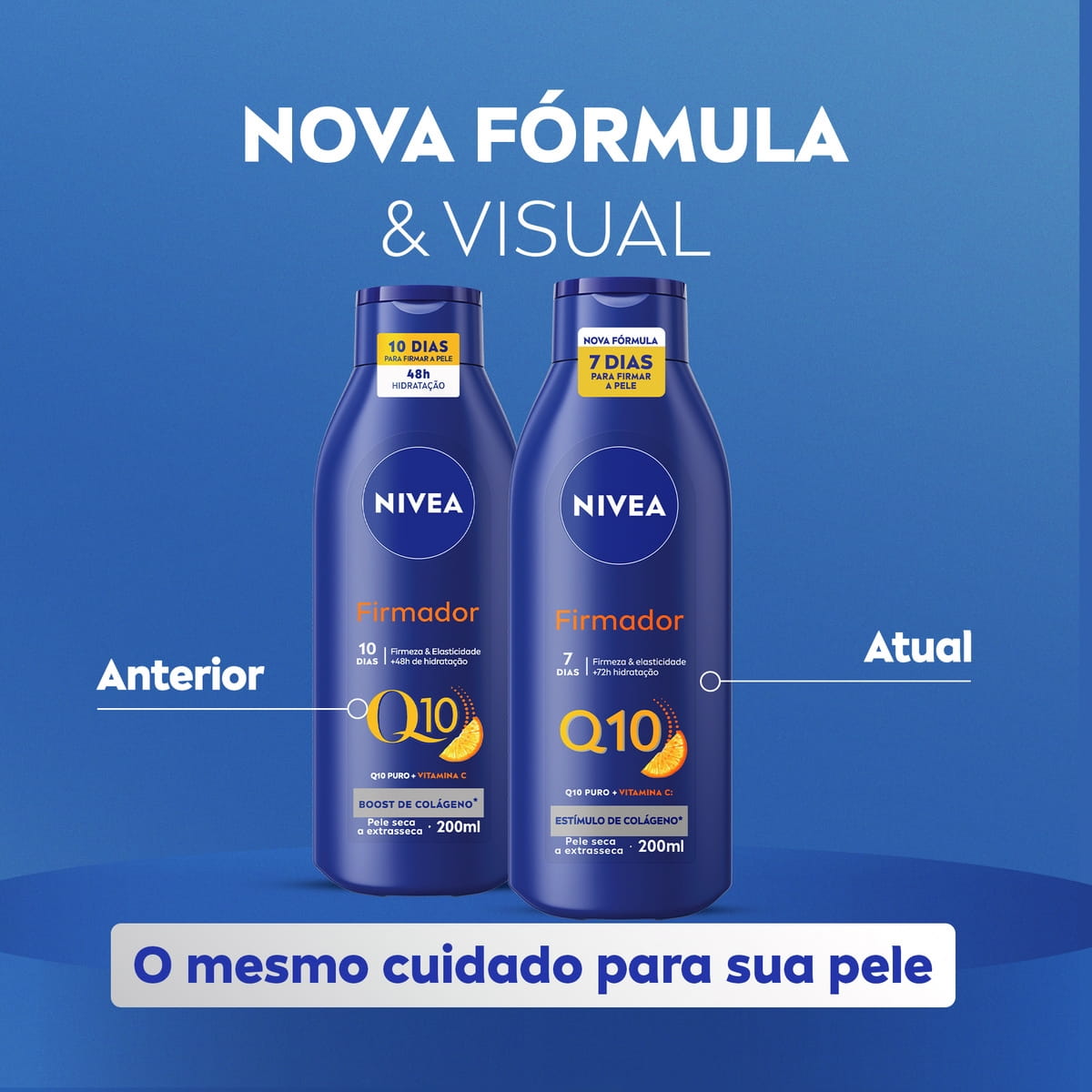 NIVEA Loção Hidratante Firmador Q10 + Vitamina C é um hidratante corporal que garante mais firmeza e elasticidade para a pele seca e extrasseca, com 48h de hidratação. Sua fórmula estimula a produção de Colágeno*, contendo Q10 Puro + Vitamina C. *Teste in-vitro
