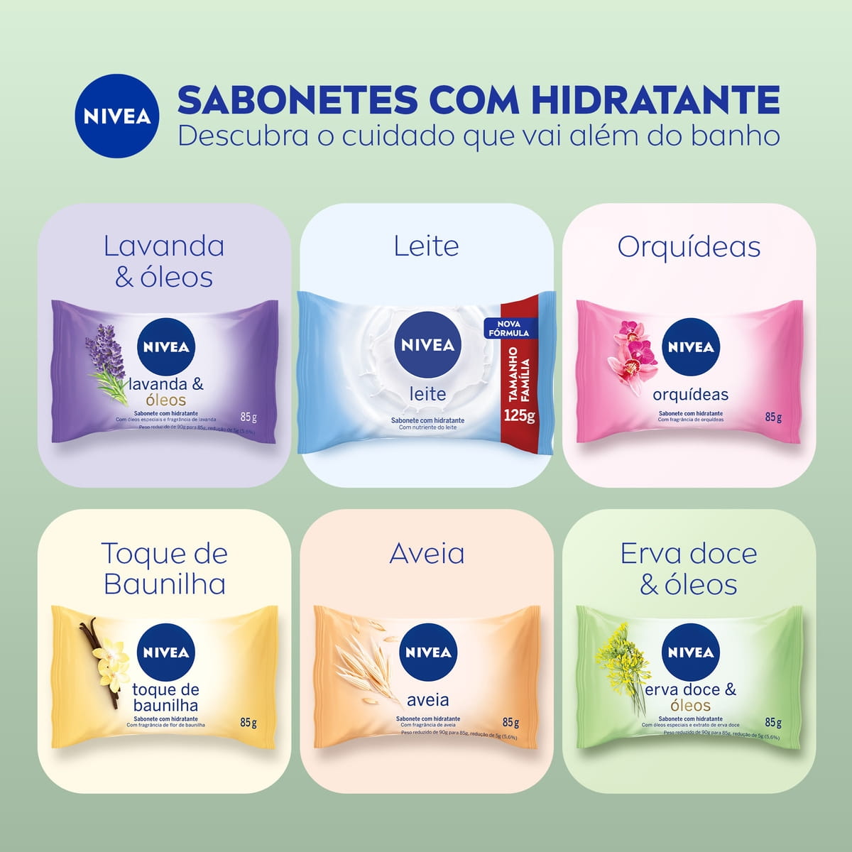NIVEA Sabonete em Barra Erva Doce & Óleos possui uma fórmula especial que limpa de forma delicada e mantém a pele hidratada mesmo após o banho.