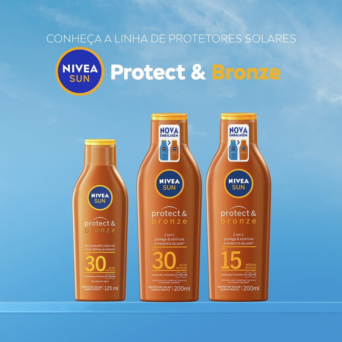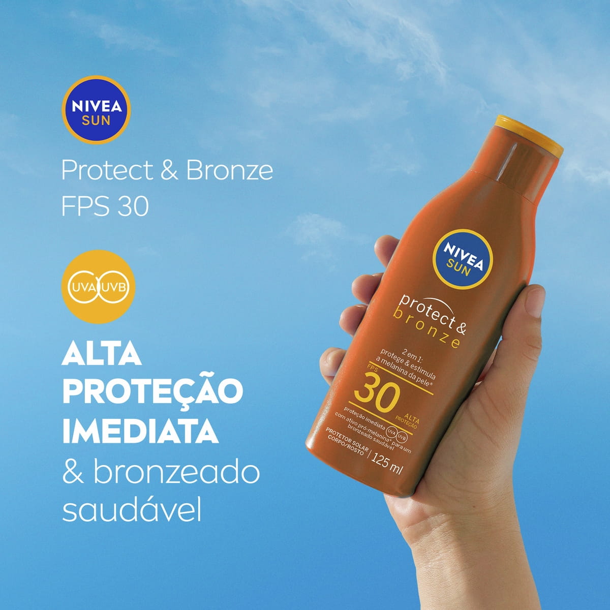 NIVEA SUN Protetor Solar Protect & Bronze FPS 30 é um produto corporal que combina bronzeador e protetor solar para proteger a pele dos raios solares, ao mesmo tempo em que proporciona um bronzeado natural.