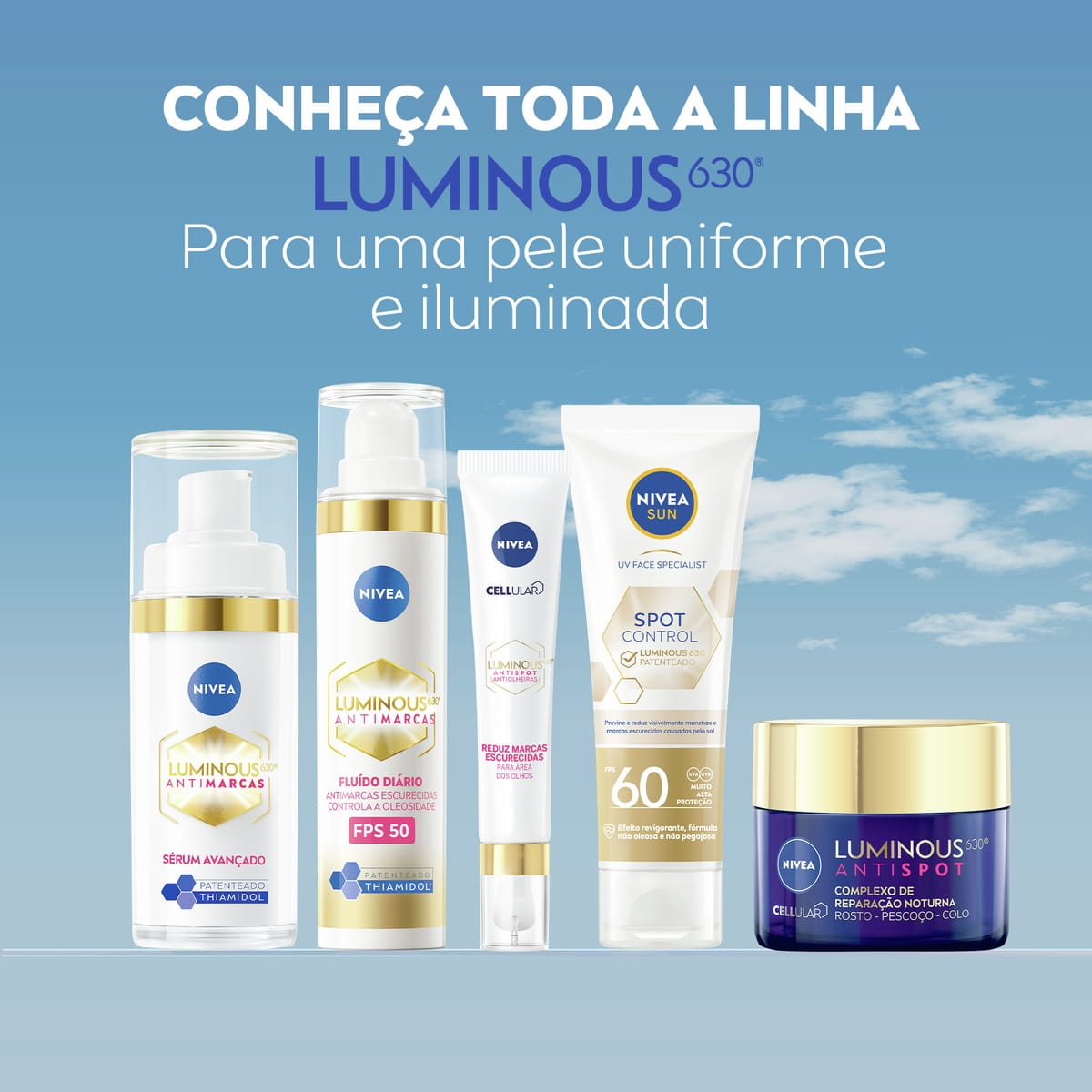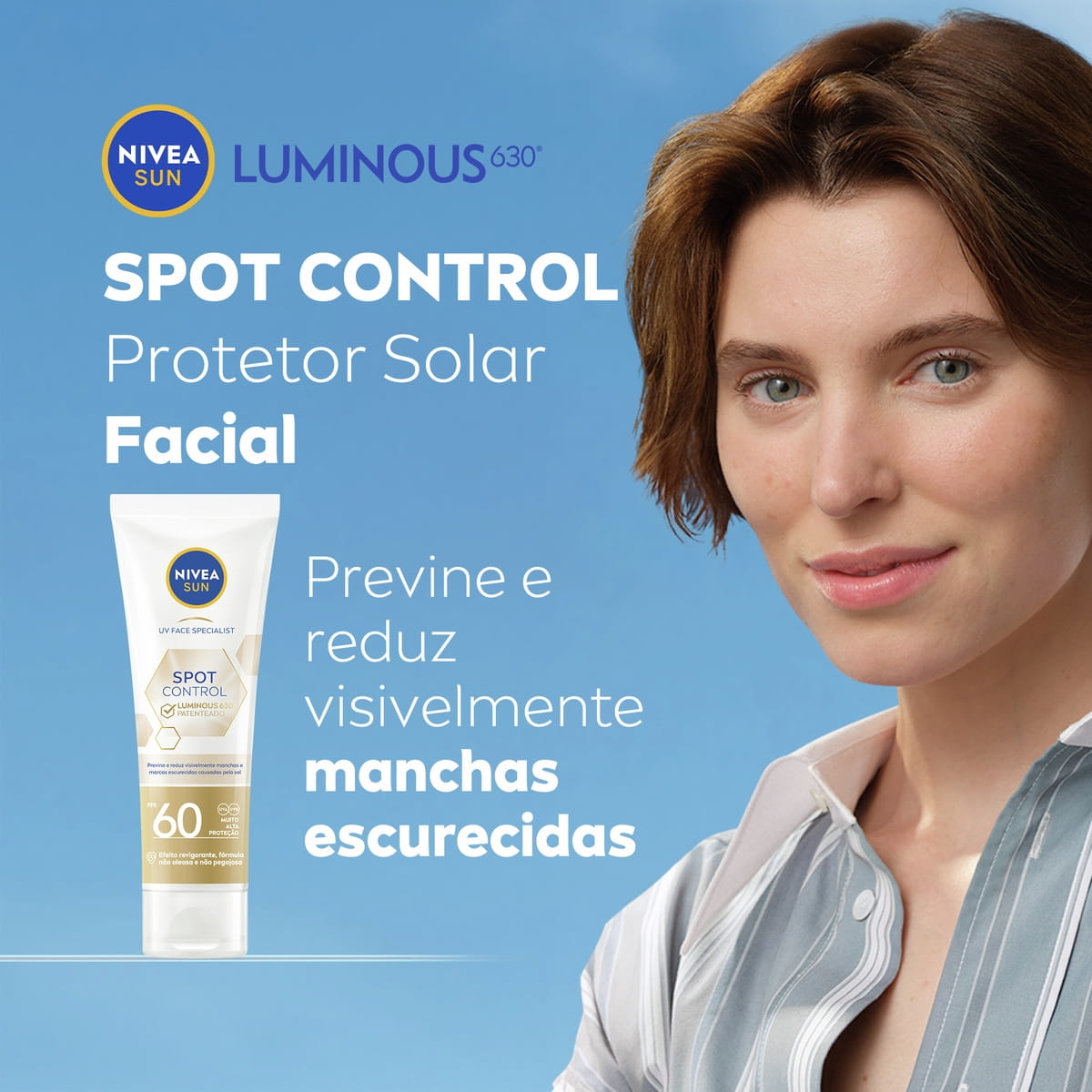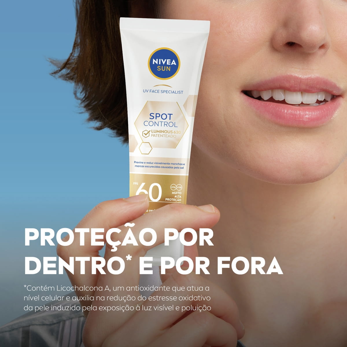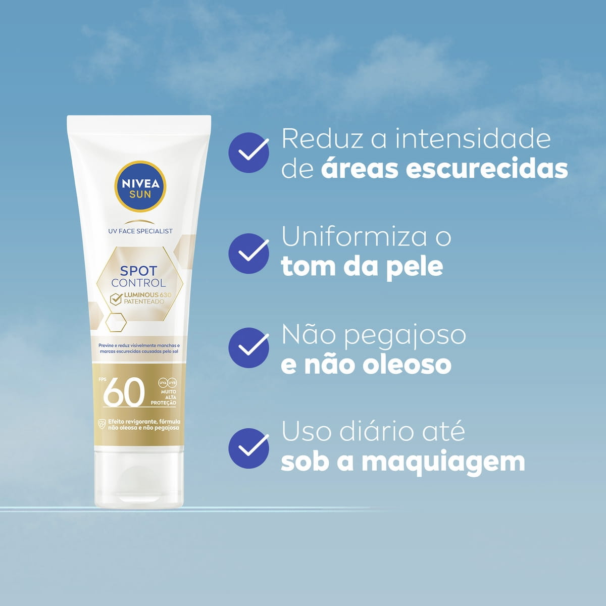NIVEA SUN Protetor Solar Facial Fluido Spot Control Luminous 630® FPS 60 é um protetor solar de muita alta proteção que previne e reduz visivelmente manchas e marcas escurecidas causadas pelo sol..