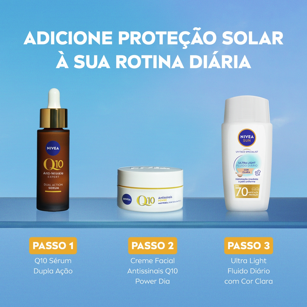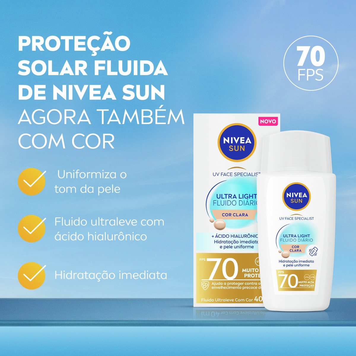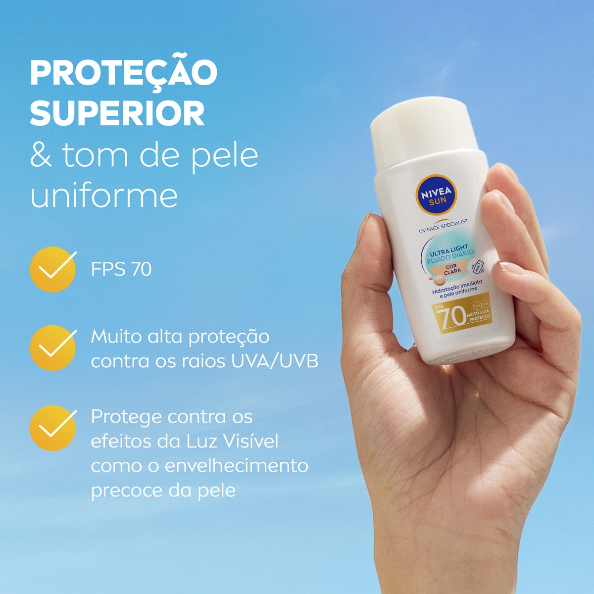 NIVEA Sun Ultra Light Fluido Diário FPS 70 Cor Clara oferece muito alta proteção solar com textura ultraleve e ácido hialurônico. Hidrata e uniformiza o tom da pele com efeito matte.