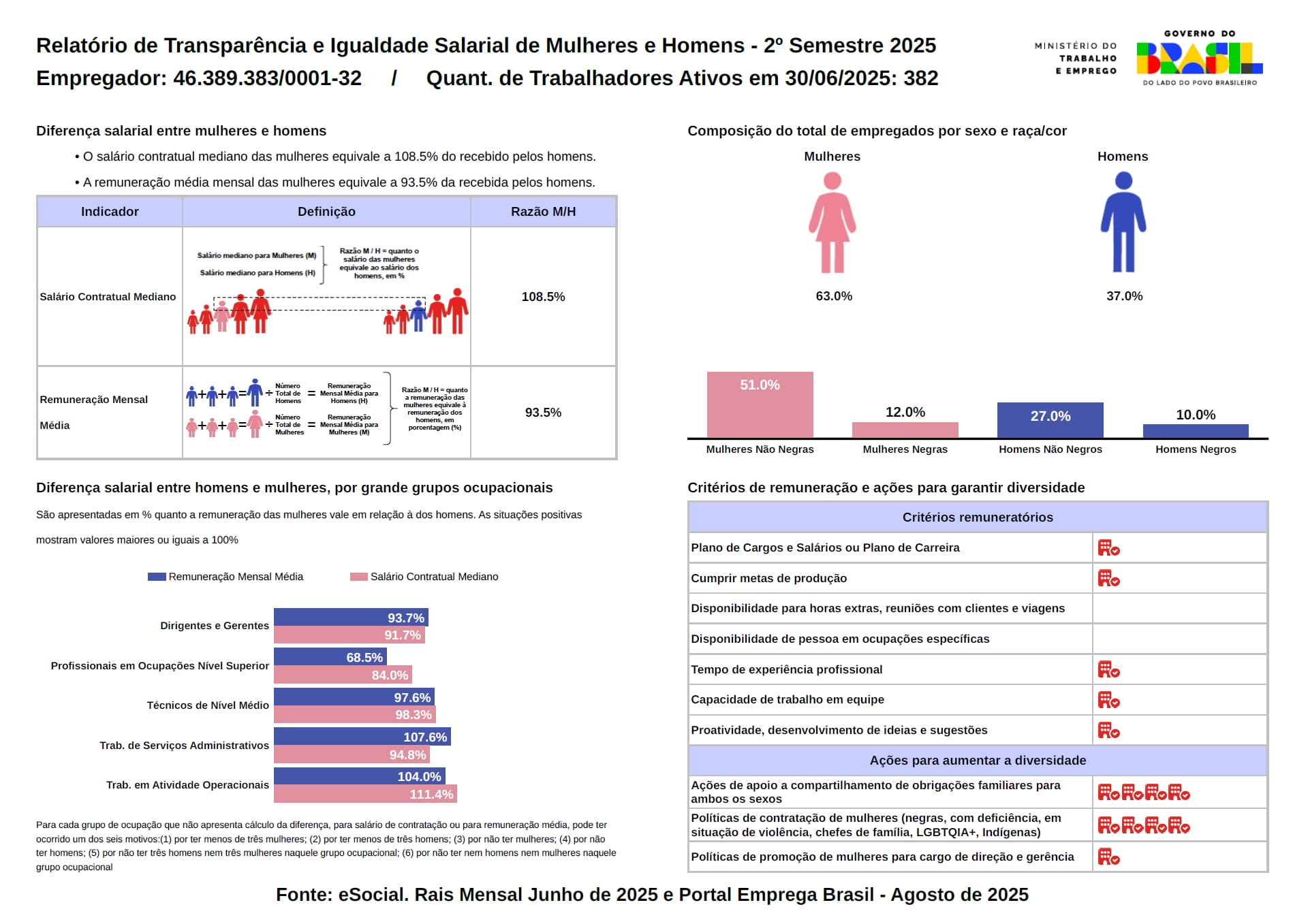 Em cumprimento às exigências da nova legislação brasileira divulgamos o Relatório de Transparência e Igualdade Salarial de Mulheres e Homens, previsto na Lei nº 14.611/2023, de acordo com o modelo fornecido pelo Ministério das Mulheres e Ministério do Trabalho e Emprego. A metodologia adotada no relatório tem como base os Grandes Grupos da Classificação Brasileira de Ocupações (CBO), considerando a organização e classificação das profissões existentes no Brasil e não consideram critérios remuneratórios como natureza da função, distinção de cargos, área de atuação, senioridade, tempo de empresa, tempo na função, produtividade e perfeição técnica de execução.