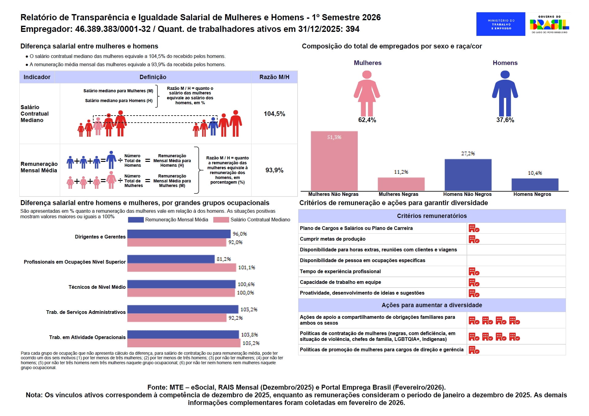 É importante notar que o Grande Grupo de Ocupação (CBO), aplicado no relatório elaborado pelo Ministério das Mulheres e Ministério do Trabalho e Emprego, em diversos casos não contempla códigos que reflitam à estrutura interna de cargos da companhia, levando a eventuais distorções. As verbas consideradas pelo MTE para fins de cálculo da remuneração também ensejam distorções, pois incluem salário condição, isto é, verbas que dependem de determinadas condições para o seu pagamento (como o adicional noturno, adicional de periculosidade e horas extras), bem como vantagens pessoais, as quais não são indicativas de discriminação de gênero.